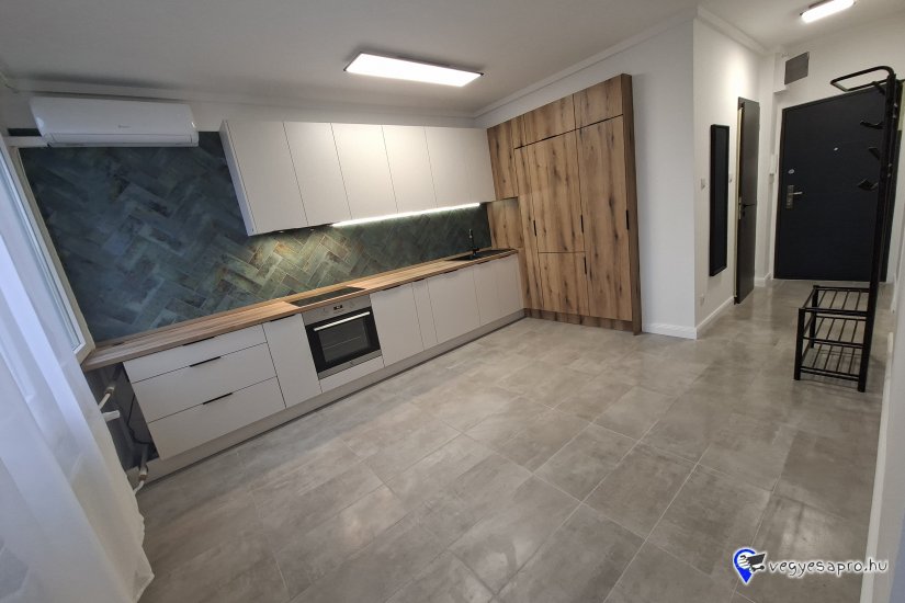 - Felszereltségét tekintve: főzőlap, elektromos sütő, páraelszívó, beépített hűtőszekrény, mosógép