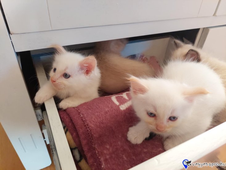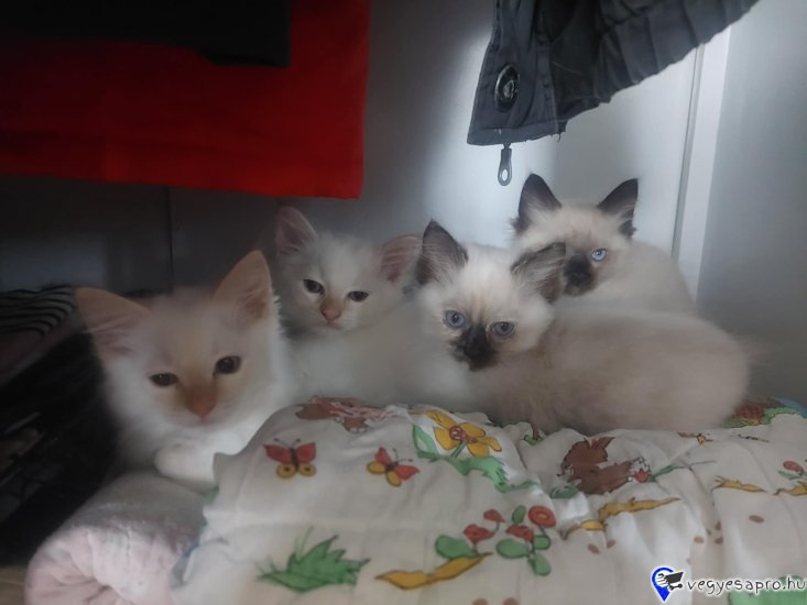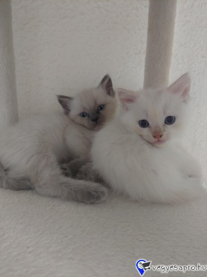 Eladó 2 red point Ragdoll fiú cica (más néven flame point Ragdoll). Október 11.-én töltik be a 10 hetes kort, koruknak megfelelő oltással, féregtelenítve. A Ragdoll általában nyugodt, barátságos, öleb természetű macska, és a Red Point ennek egy különleges színváltozata. A Red Point azt jelenti, hogy a cica fülei, pofija, farka és lábvégei vöröses (narancsos pirosas) árnyalatúak. A test színe általában világos krém vagy fehér. Szemük élénk kék, ami minden Ragdollnál fajtaszabvány. Bundájuk félhosszú, puha, selymes tapintású, kevésbé hajlamos a filcesedésre. A ragdoll cicák kifejezetten nyugodt, puha természetű macskák. Nagyon emberközpontúak, sokszor ölbe ülnek vagy elernyednek, amikor felemelik őket (innen ered a nevük: rongybaba ). Általában jól kijönnek más macskákkal, kutyákkal, gyerekekkel. A Red Point változat viszonylag ritkább, mint a "hagyományos" seal vagy blue point. Kicsit élénkebbek és játékosabbak, a vörös színt adó gén sok más fajtánál is összefüggésbe hozható aktívabb, vagányabb személyiséggel. A piros kandúrok híresek arról, hogy kicsit bolondosak, játékosak, viccesek.