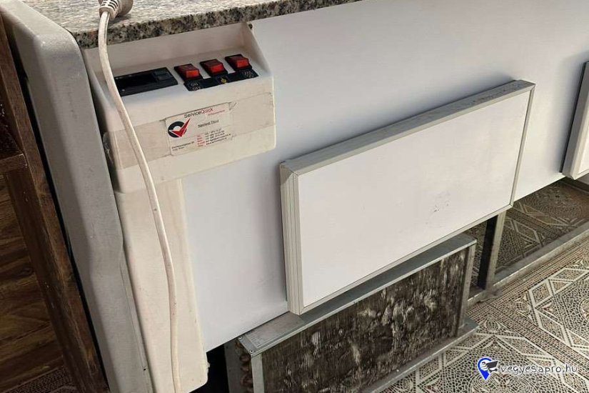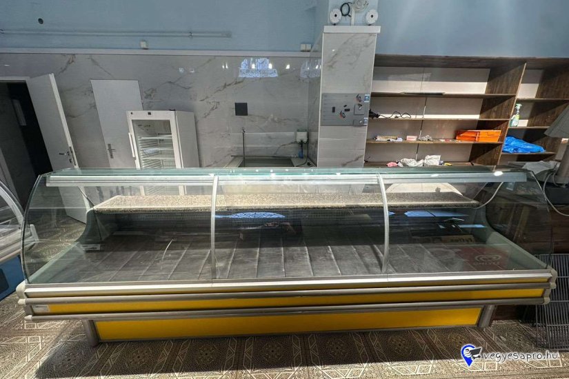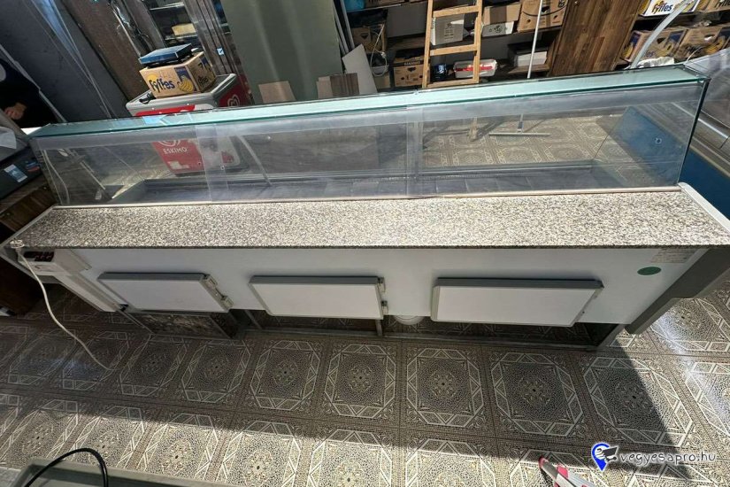 Eladó a képen látható 300cm. széles, hajlított, ívelt üveges alsó tárolós, kitünő állapotban lévő használt hűtőpult.