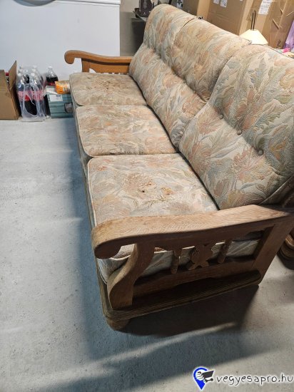 Eladó egy 3-as kanapé fotellel és 2db.tömör fa asztal. Felújításra szorul.
