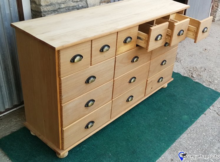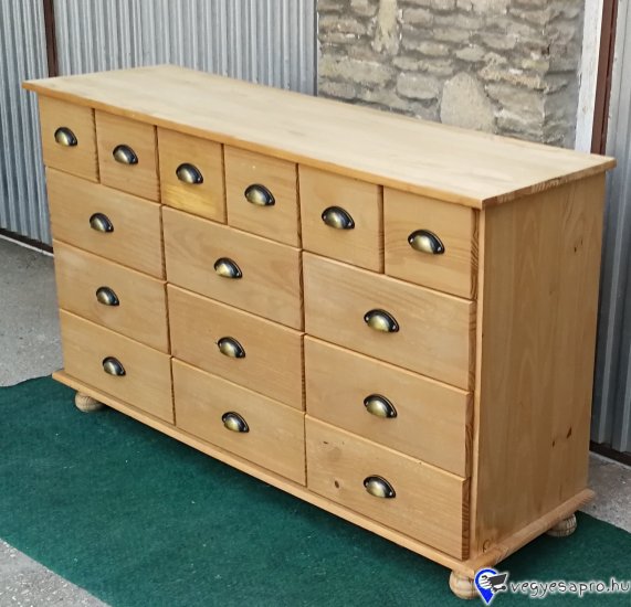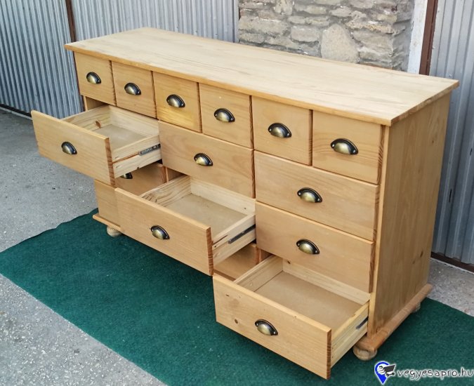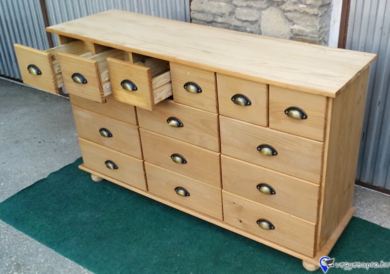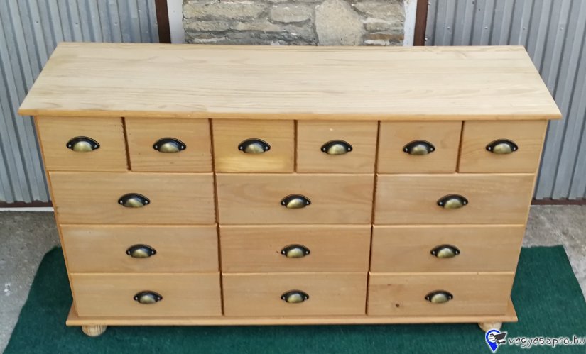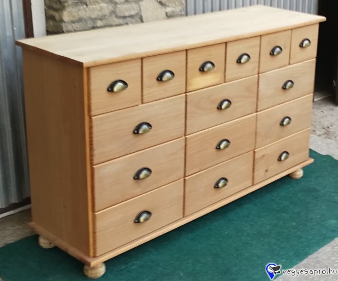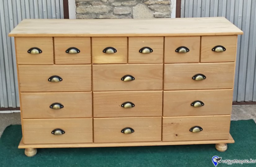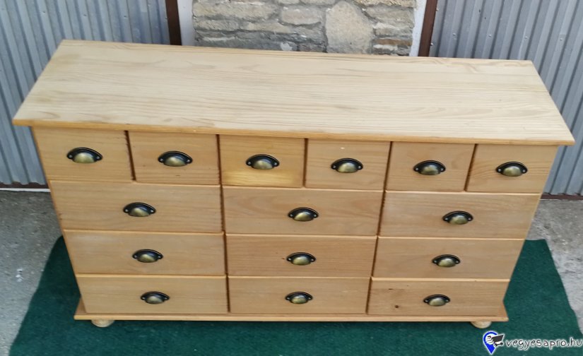 Fenyőfából készült komód 15 fiókkal, fém fogantyúkkal eladó a képen látható állapotban.