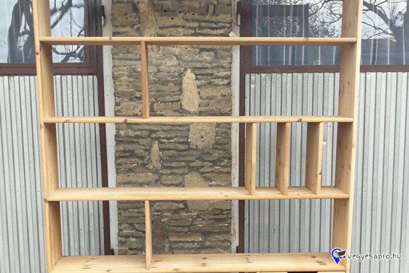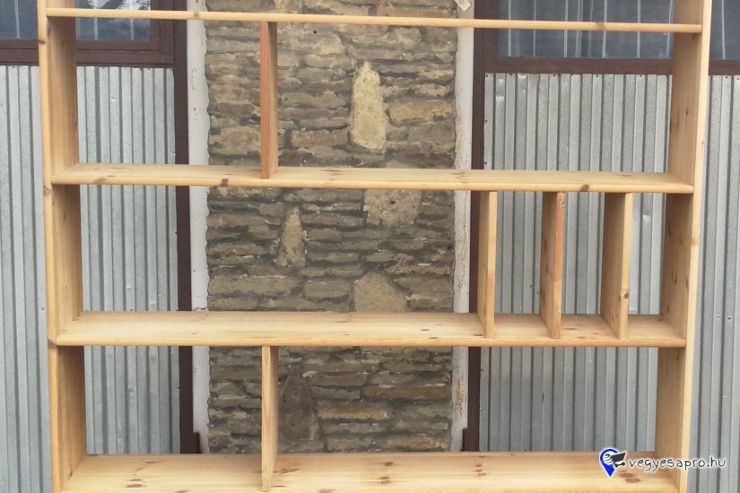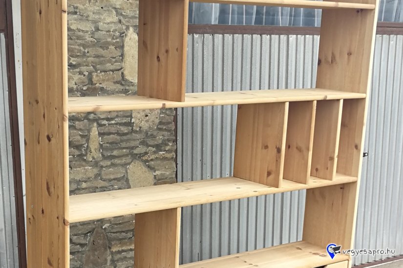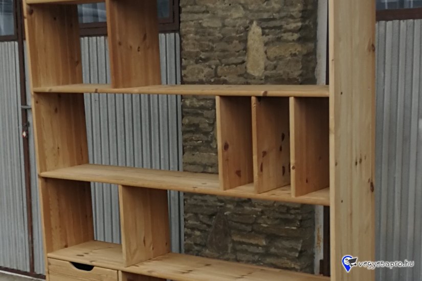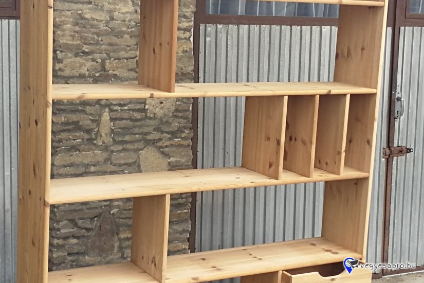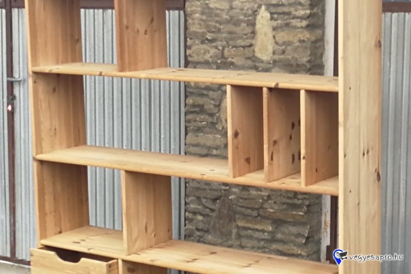 Jó állapotban lévő fenyőfából készült térelválasztó polc, 4 fiókkal.