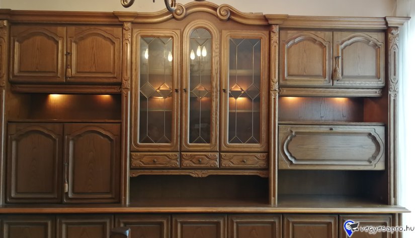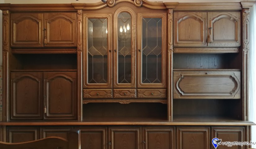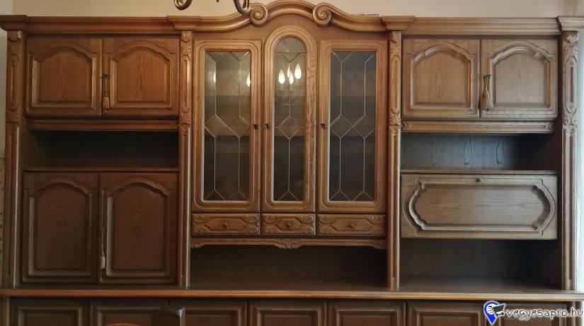 Tölgyfa frontos nappali szekrény, ólombetétes üveg ajtókkal, stílusváltás miatt eladó. Apró karcok használati nyomok láthatók rajt. A termék lapra szerelt állapotban van.