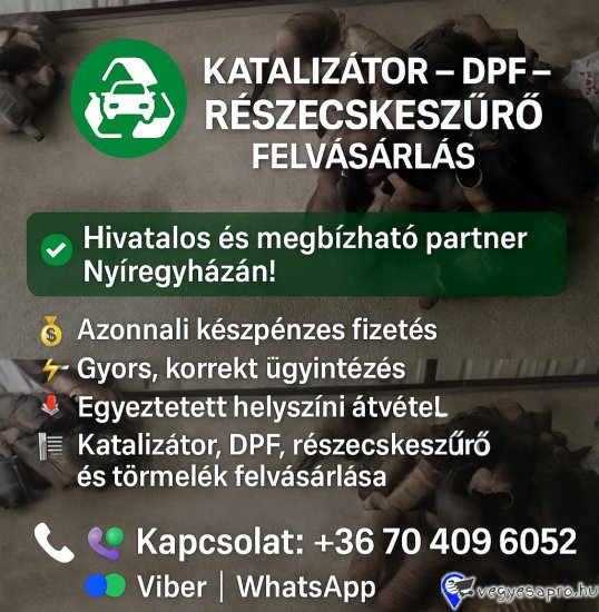 megvásároljuk használt gyári katalizátorját♻️ KATALIZÁTOR – DPF – RÉSZECSKESZŰRŐ FELVÁSÁRLÁS ✅ Hivatalos és megbízható partner Nyíregyházán! --- Azonnali készpénzes fizetés ⚡ Gyors, korrekt ügyintézés Egyeztetett helyszíni átvétel Katalizátor, DPF, részecskeszűrő és törmelék felvásárlása --- Kapcsolat: +36 70 409 6052 Viber | WhatsApp Előzetes időpont-egyeztetés szükséges! Beazonosítás menete: Küldje el a katalizátor sorszámát vagy egy jól olvasható fotót, és 10, percen belül visszajelzünk! --- Google Térképen már elérhetőek vagyunk! De kérjük, érkezés előtt mindig hívjon fel minket! ➡️ +36 70 409 6052 --- ✅ Megbízhatóság • Korrektség • Partneri hozzáállás Válasszon hivatalos felvásárlót Nyíregyházán! #Katalizátor #DPF Részecskeszűrő #Felvásárlás #Nyíregyháza +36 70 409 6052 #KATALIZÁTOR | #DPF | #RÉSZECSKESZŰRŐ #FELVÁSÁRLÁS – #NYÍREGYHÁZA