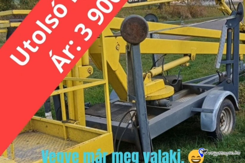 Eladó Bison Palfinger K12 típusú utánfutóra szerelt kosaras karos emelőgép, felújított állapotban. Max. munkamagasság: 12 m Állapot: felújított, jó állapotú Kialakítás: utánfutóra szerelt (az utánfutó nem rendszámos) Felhasználás: villanyszerelési munkák, homlokzati munkák, faápolás/fakitermelés, karbantartás, egyéb magasban végzett munkák Helyszín: Hajdúdorog (megtekintés előre egyeztetett időpontban). Érdeklődni és megtekintési időpontot egyeztetni: +36 70 650 4952