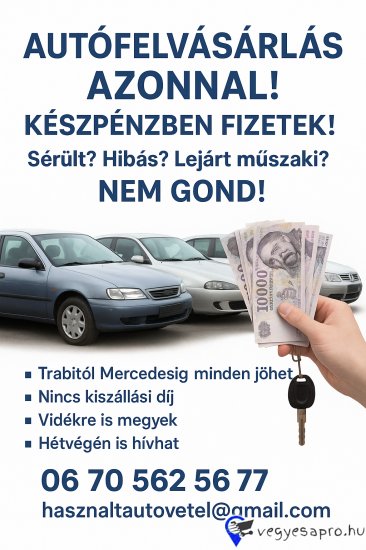 Autót vennék 1984-es évjárattól, akár: sérült, hibás, lejárt műszakis, vagy forgalomból kivont is! Trabitól a Mercedesig minden érdekel! Azonnali készpénzes fizetés, nincs kiszállási díj, vidékre is megyek, hétvégén is dolgozom! ???? 06 70 562 56 77 ???? hasznaltautovetel@gmail.com