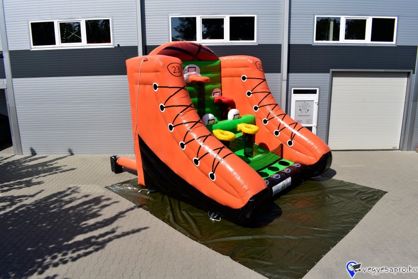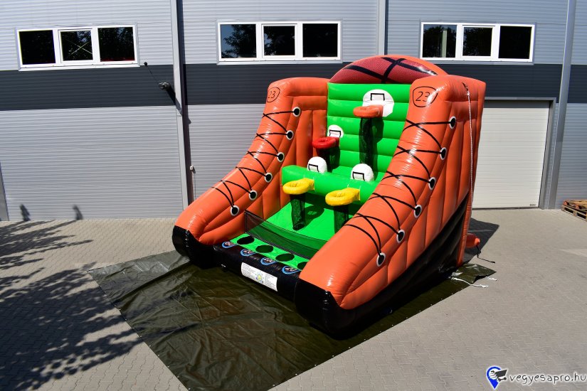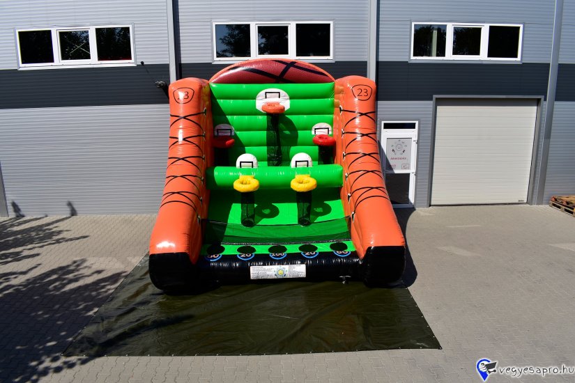 Remek ügyességi játék a kosárlabda kedvelőinek. A játék célja, hogy minél több pontot gyűjtsünk a kosárlabdák bedobásával. Ajánlott korosztály: 6-14 éves korig. Működtetésének feltételei: 4×5 méteres sík terület, minimum 4 méter magas hely, valamint 230 V-os áram szükséges az 1,5 kW-os befúvó motor működtetéséhez. Online foglalás itt: http://www.elmenyjatek.hu/php/kosarlabda-palya.php
