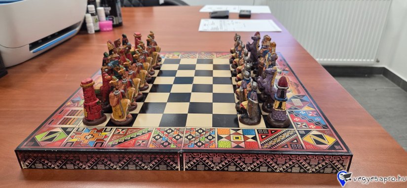 Eladó egy egyedi megjelenésű, 40×40 cm-es sakk készlet, amely remek választás mind játékhoz, mind dekorációnak. A tábla stabil, szépen kidolgozott, a figurák teljesek és sérülésmentesek. Ritkán kapható ilyen stílusú darab, igazi különlegesség! Átvehető Vecsésen vagy a XVIII. kerületben. Előre utalás után plusz postaköltség esetén küldöm. Tel.:06209413596