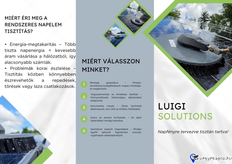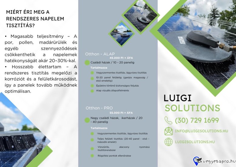 Szeretné, hogy napelemei újra a legjobb teljesítményt nyújtsák? Cégünk napelemrendszerek tisztításával, karbantartásával, telepítésével és bővítésével foglalkozik. -Professzionális, kíméletes tisztítás- hogy a panelek ismét maximális hatékonysággal termeljenek. -Rendszeres karbantartás a meghibásodások megelőzéséért. -Új rendszerek telepítése, meglévők bővítése az igényeihez igazítva. -Magánszemélyeknek és cégeknek egyaránt. Az ár a munka jellegétől függően egyedi ajánlat alapján kerül meghatározásra!
