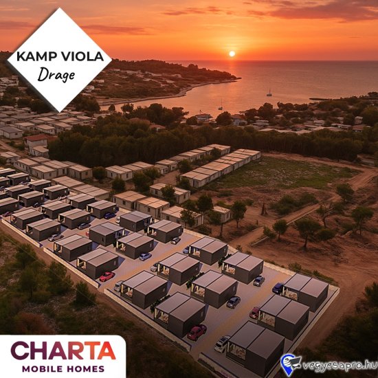 A Drage-ban található Viola kemping kellemes kilátást nyújt a tengerre és a közeli szigetekre. Egy enyhén lejtős dombon található, a strandokra néz, amelyek mindössze két perc alatt elérhetők egy kellemes sétával. A Camping Resort Viola a tengerparton található, egy csendes, jól karbantartott tengerparti területen, és jó befektetési lehetőséget kínál mobilházak turisztikai bérbeadásába. A projekt különlegessége a tágas telkek, amelyeken ?? ?² és ?? ?² mobilházak elhelyezhetők. 32 m²-es mobilház modell + 32 m²-es terasz ára: 49 500 € + ÁFA 24 m²-es mobilház modell + 24 m²-es terasz ára: 37 000 € + ÁFA Éves átalánydíj: 6 000 € Becsült éves bérleti díj: 15 000 € – 20 000 € Érdekli egy ház a saját nyaralásához, vagy szeretne kiegészítő bevételt generálni házak bérbeadásával? A Charta Mobile Home csapata minden lehetőségre kínál megoldást – használja ki tapasztalatunkat és ismeretségi hálózatunkat. Az ötlettől a megvalósításig minden lépésben Önnel vagyunk, függetlenül attól, hogy mobilházakba szeretne befektetni, vagy földtulajdonos és kemping építésén gondolkodik. Ha már tervezel a jövő évre, keress minket az alábbi elérhetőségeken: +385 (0)99 738 5893 Mail:info@charta-nekretnine.hr Web: https://charta-nekretnine.hr/product/mobilne-kucice-resort-viola/