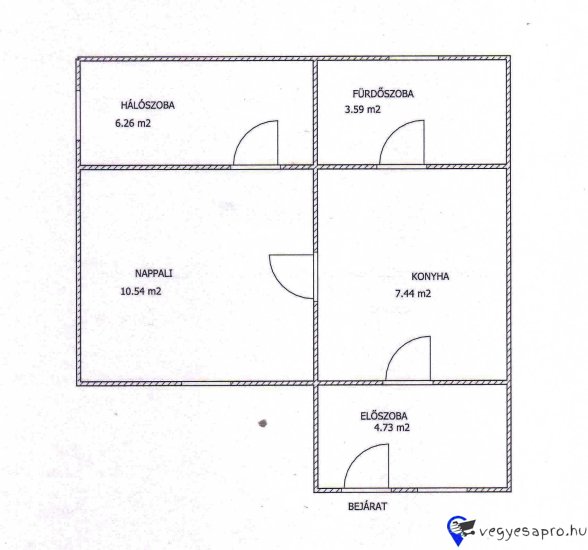 4, 73 m előtér, 7, 44 m konyha, 3, 59 m zuhanyzós fürdő + WC, 10, 54 m nappali, 6, 26 m hálószoba, modern mintázatú gres burkolatok.