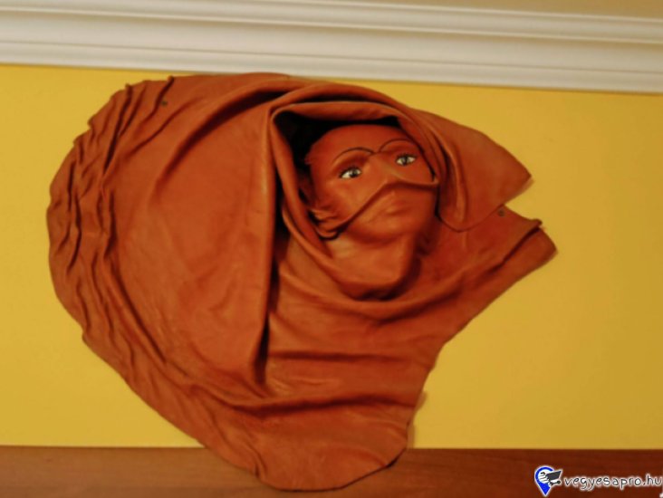 Eladó egy bőrből készült maszk, mely egy női arcképet ábrázol. Fali dekoráció, különleges darab.