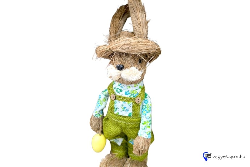 Húsvéti dekoráció – természetes rost nyuszi sárga tojással és zöld mellénnyel, 39 cm
