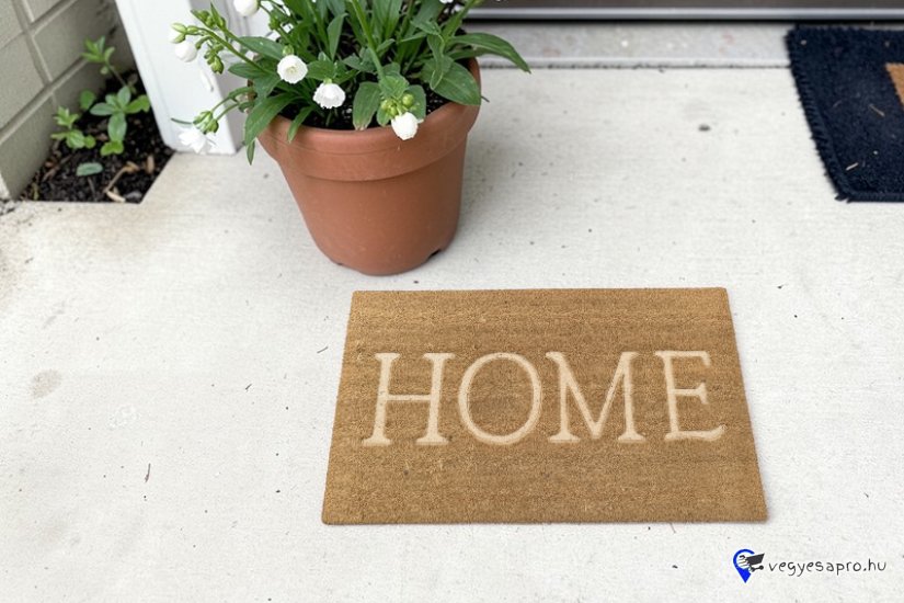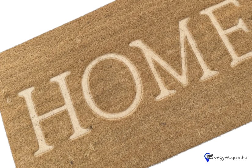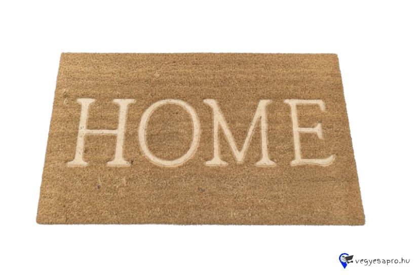 Természetes hatású bejárati lábtörlő „HOME” felirattal, amely barátságos és otthonos hangulatot teremt az ajtó előtt.