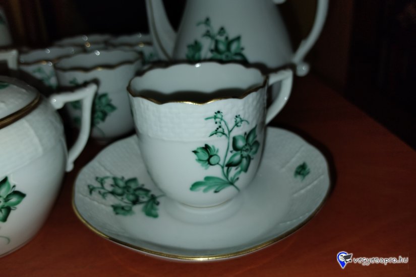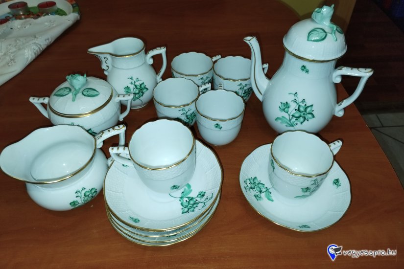 Eladó a képeken látható, eredeti Herendi porcelán készlet, dekoratív zöld virágmintával dús aranyozással. Kávéskanna, cukortartó, tejkiöntő, 6 db csésze + 6 db alátét tányér. A készlet szép állapotban van, a tetőkön található plasztikus rózsafogók teljesen épek, lepattanás mentesek. Az aranyozás a szegélyeken megkímélt.