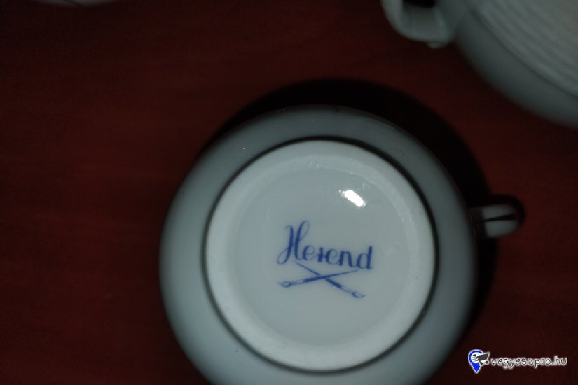 Jelzés: a darabok alján a Herendi Manufaktúra ritkább, „tanuló/gyakorló” jelzése látható (kék Herend felirat, alatta keresztbe tett ecsetekkel). Ez a jelzés igazolja a kézi festést és a Manufaktúrán belüli eredetet.