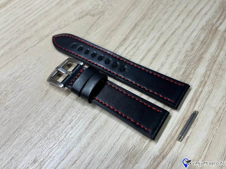 A kényelmes és nagyon finom tapintású bőr óraszíjak ezüst fém csattal lettek ellátva és piros cérnával vannak varrva, hogy ezzel is mutatósabb, elegánsabb hatást váltsanak ki viselőjéből. A szíj külső és belső része is fekete színű.