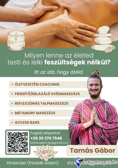 ÜNNEPI AKCIÓK! FOGADOK MUNKÁT! Tamás Gábor vagyok. Elérhető szolgáltatásaim: Frissítő relaxáló svédmasszázs. Reflexzónás talpmasszázs. Metamorf masszázs. Access Bars. Életvezetési coaching. XIII.kerület Parádé szalonban, illetve XIV.kerület Kassai térnél várlak sok szeretettel! A Reiki tiszta áramló energiáját alkalmazom minden tevékenységem során. 100%-ban természetes, vegán olajokat használok masszázsaim során. Az alábbi honlapon lehet olvasni bővebben a tevékenységemről és az eredeti árlistáról: https://masszazs13.hu/masszorok/tamas-gabor-masszor/ Az Access Bars egy különleges energetikai módszer, amelynek célja a nagyobb tudatosság és belső könnyedség megteremtése. A kezelés során a fejen található 32 pont (ezek a bars-ok) gyengéd érintésével oldódnak az önkorlátozó gondolatok, hiedelmek és érzelmi blokkok, ezzel teret enegedve az újnak, a pozitívnak. Kézzelfogható hatások: – mély relaxáció és ellazulás – stresszoldás és jobb közérzet – alvászavarok enyhülése – motiváció és energiaszint növekedése Az akció időtartama alatt: 60 perc 11500 Bérlet 4×60 perc 41000 Az akció január 15.-ig tart. Csak abban az esetben érvényes az akció ha bármelyik elérhetőségemen, ahogy jelentkezel megemlíted a kódot! Kód:fénysor